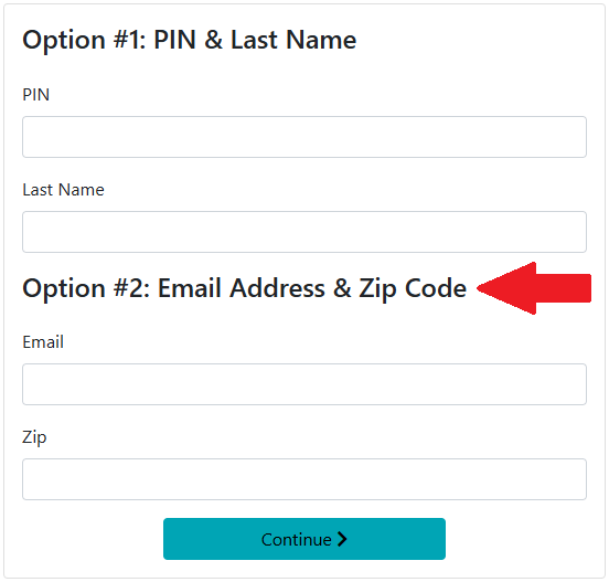 - Enter your email address and zip code under Option #2 (you do not have a PIN yet)