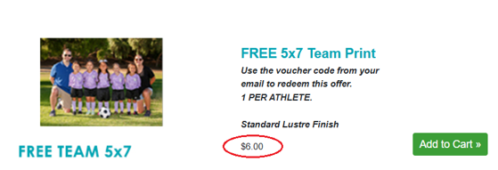 - On the next page, the FREE 5x7 Team Print, priced at $6.00, should be the first option